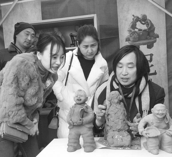 3月19日,参展第九届“中原古韵——中国淮阳非物质文化遗产展演”活动的“中原泥人”张振福的泥塑作品,乡土气息浓厚,人物表情丰富,造型朴实夸张,深受大家喜爱。图为张振福现场向观众表演泥塑制作。记者 卢好亮 摄