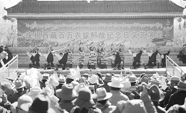 当日是“西藏百万农奴解放纪念日”,在拉萨市布达拉宫山脚下的龙王潭公园内,来自拉萨和日喀则的文艺演员,为广大群众献上舞蹈、歌曲、藏戏、小品等文艺节目,庆祝西藏百万农奴解放59周年。新华社发