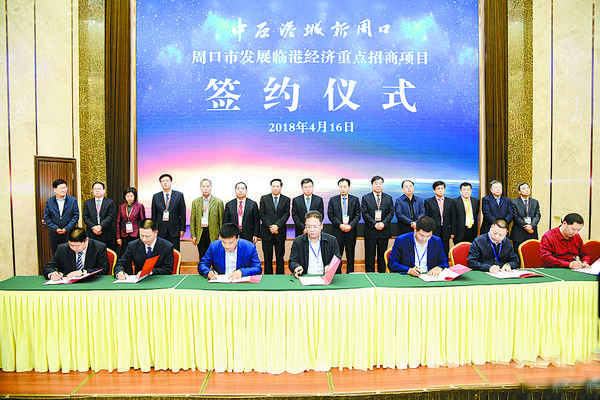 当天上午9时30分,2018临港经济高峰论坛举办周口市发展临港经济重点招商项目签约仪式。安钢集团公司产能置换项目、安顺仓储物流项目、黑蜘蛛产业互联网生态平台项目、和润物流及粮油深加工项目、电商物流产业园项目、供销集团电商物流园项目、电子商务及冷链物流中心项目、医药物流园项目、邓城港物联园区项目、智能冷链物流集散中心港项目、安途物流园项目、屋顶分布式光伏发电项目、人保控股建材产业园项目、春兰空调生产基地项目、服装加工生态产业园项目等35家相关企业分别与周口签约。项目涵盖制造业、服务业、商贸业、物流业等多个领域。