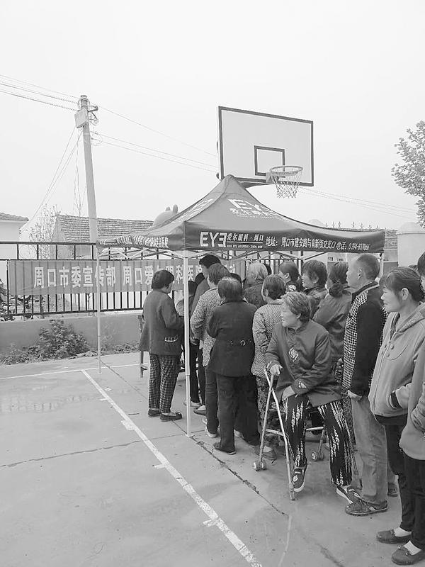 为满足群众基本医疗需要,市委宣传部在4月联合市中医院开展义诊活动后,又根据群众呼声,于5月11日联合周口爱尔眼科医院到强陵岗村开展义诊活动。图为义诊活动现场。 钟哲 摄