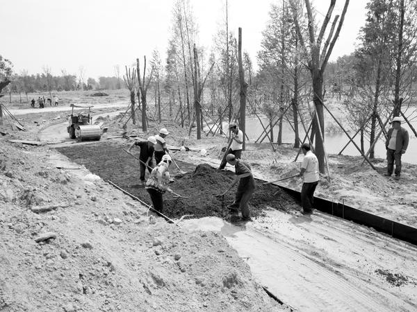 “五城联创”工作启动以来,我市全力推进全国绿化模范城市创建工作,目前植物园升级改造项目正在加快推进。图为工作人员铺设植物园沿湖便道。