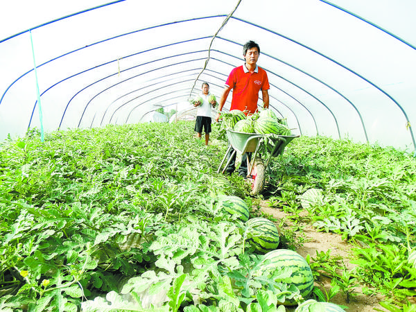 沈丘县周营镇新王庄村的瓜农正在大棚里采摘西瓜。近年来,该县积极引导农民大力发展无公害特色高效农业,其中大棚西瓜已发展到2万余亩,亩均纯收入1.6万余元。谢辛凌 摄
