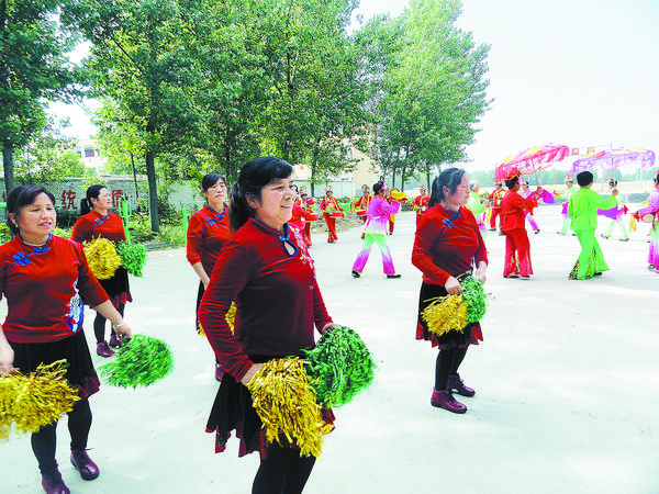 5月23日,商水县白寺镇北岳村的村民正在文化广场跳广场舞、打腰鼓。去年,该村建了文化广场、文化大院,成立了上百人的腰鼓队、广场舞队。她们每天晚上在广场打腰鼓、跳广场舞,既锻炼身体,又活跃文化生活。