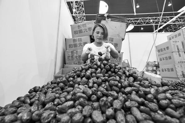 5月25日,在三门峡国际文博城,客商在整理新疆和田大枣。当日,第六届中国特色商品博览交易会在河南省三门峡市开幕。本届特博会共规划展区1.6万平方米,国际标准展位680个,中国以及来自阿富汗等18个国家和地区的600多家客商参展。新华社记者 冯大鹏 摄