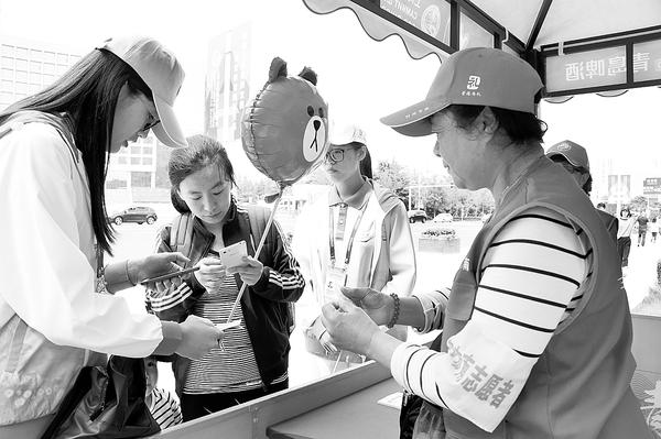 近2万名城市运行志愿者上岗服务上合青岛峰会 5月27日, 几名城市运行志愿者在街头为游客提供咨询服务。近日,来自青岛各行业的近2万名志愿者开始上岗,为2018上海合作组织青岛峰会会议提供城市运行志愿服务。新华社发