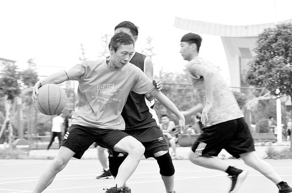 篮球运动是较为普及的体育项目,在我市有着深厚的群众基础,省运会篮球比赛将于7月开赛。图为篮球爱好者自由组队比赛。