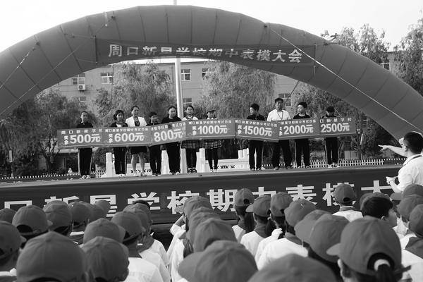 本报讯 (记者 陈军强 通讯员 桑流党 文/图) 5月14日下午,周口新星学校小学部举行期中表彰大会(如右图)。小学部4000多名师生参加了大会,成绩优异者分获500元、600元、800元、1000元、1500元、2000元、2500元的现金奖励。