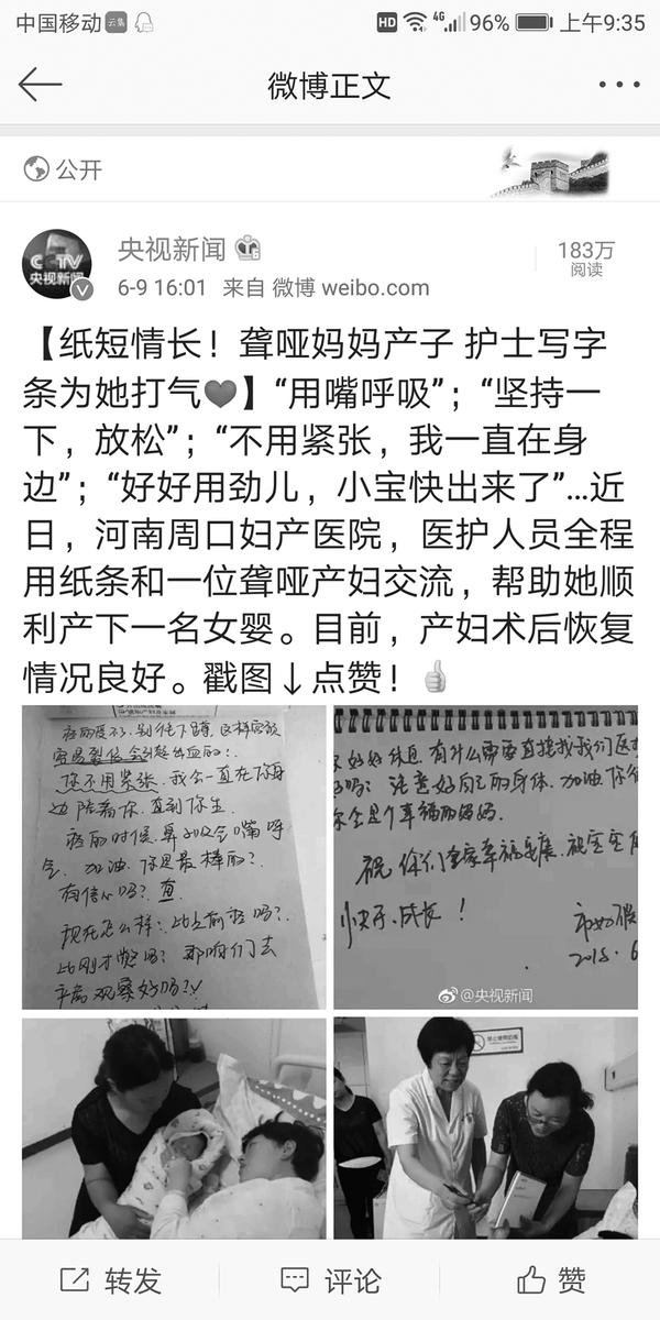 本报讯 (记者 马月红 窦娜) 6月9日16时01分,“央视新闻”推送了《纸短情长!聋哑妈妈产子 护士写字条为她打气》这样一条微博(如图)。这条微博写的是一位聋哑妈妈在周口妇产医院产子,医护人员写字条为她打气的事情。微博中写道:“‘用嘴呼吸’;‘坚持一下,放松’;‘不用紧张,我一直在身边’;‘好好用劲儿,小宝快出来了’……近日,河南周口妇产医院,医护人员全程用纸条和一位聋哑产妇交流,帮助她顺利产下一名女婴。目前,产妇术后恢复情况良好。”