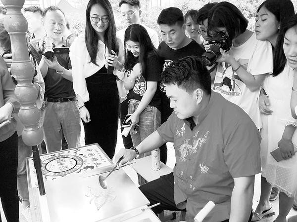 此次活动邀请了手工芦苇画、刘氏糖画、蛋雕、泛川派古琴、周家口剪纸等“非遗”项目传承人来到校园,为大学生们进行现场展示。记者看到,大学生对糖画制作过程非常感兴趣,把刘氏糖画展示区围得水泄不通(如右图)。制作糖画时,刘氏糖画传承人刘军先舀起一勺溶化了的糖汁,在案板上快速地“浇铸”出动物、花鸟等各种造型,再趁热粘上竹签,便大功告成了。据了解,刘军从事糖画制作已经26年了。这次,他专程从杭州赶来参加活动,目的是让更多大学生了解糖画的历史和制作过程。