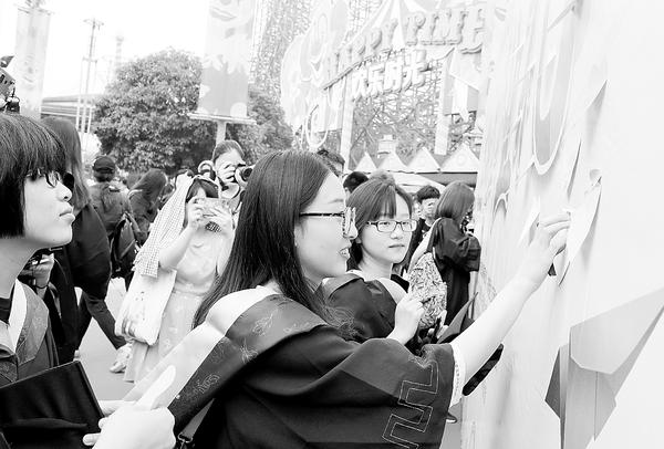 6月10日,毕业生们将写着自己毕业愿望的贴纸贴到留言墙上。 当日,来自上海10余所高校的近80名应届大学本科毕业生来到上海欢乐谷,参加在这里举行的过山车毕业礼活动。 新华社发