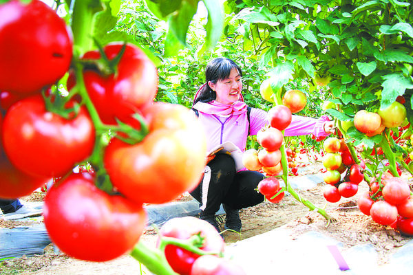 依托河南农业大学专家团队,扶沟县蔬菜研究院研发出400多个番茄新品种,通过集中展示让种植户优中选优,并实施对贫困户购买种苗优惠50%、特困户免费供应的优惠政策,带动206户贫困户实现脱贫。图为工作人员正在记录番茄新品种的试验数据。谷志方 摄