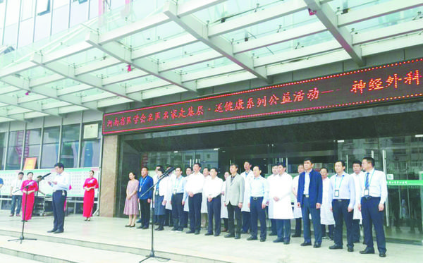 本报讯 (记者 刘玉娟 通讯员 郭永伟 文/图) 5月25日上午,河南省医学会名医名家“走基层 送健康”系列公益活动——神经外科学分会走进周口启动仪式在市中心医院举行。河南省卫生和计划生育委员会正厅级巡视员黄玮,省医学会副会长兼秘书长王伟,省医学会神经外科学分会主任委员、郑州大学第一附属医院教授刘献志,周口市人民政府副秘书长宋力,市卫计委主任刘炯、副主任刘双国以及市中心医院院长于彦章,党委书记陈波舟,副院长吕燕平、张晓阳、崔颖、陈国峰等领导和专家出席启动仪式。