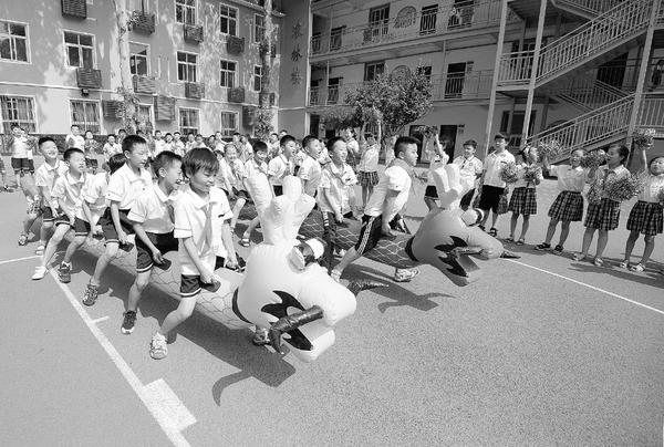 6月15日,河北省邯郸市农林路小学学生在参加“旱地龙舟”比赛。