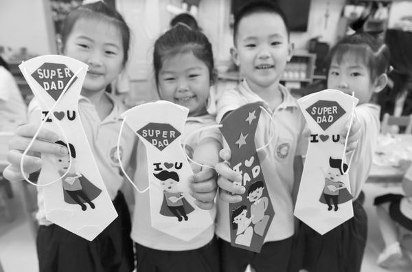 6月14日,合肥市经开区中环城幼儿园的小朋友们展示自己制作的创意小领带。