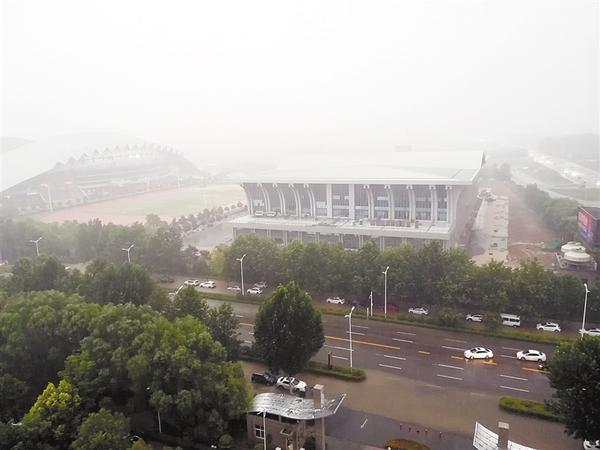 昨日傍晚,一场暴雨突袭中心城区,给下班市民造成不便的同时,也带来了丝丝凉意。图为暴雨中即将完工的市游泳馆。记者 张廉明 摄