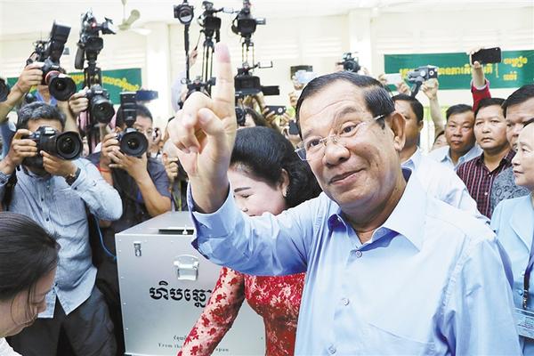 7月29日,在柬埔寨干丹省的一个投票站,柬埔寨首相洪森投票之后展示蘸有墨水的手指。柬埔寨国会选举于29日进行投票。新华社发