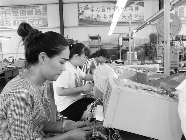 近年来,沈丘县付井镇通过整合资源,加大招商引资力度,将企业工厂搬到村头,有效解决了当地群众的就业问题,从而走出了一条“造血式”产业扶贫新路子。图为8月1日,该镇赵口村的20余名留守妇女正在村办电子厂里加工电子数据线。