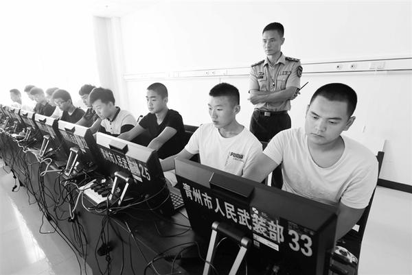 8月1日,应征青年在山东省潍坊青州市征兵体检站进行心理测试。