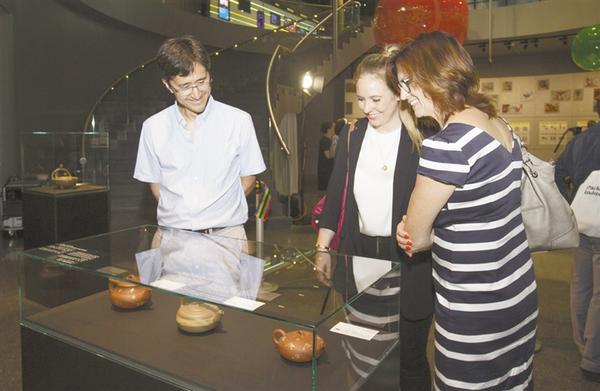 7月31日,来宾参观展出作品。在北京申冬奥成功三周年之际,旨在通过中国紫砂艺术诠释奥林匹克精神、为北京冬奥会加油的五环·五色——吕俊杰冬奥主题紫砂艺术展31日在瑞士洛桑奥林匹克博物馆开展。这也是中国陶瓷艺术家首次在奥林匹克博物馆举办冬奥主题紫砂艺术展。