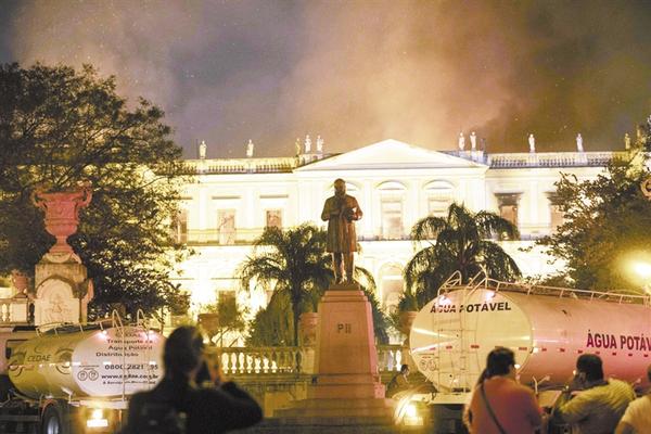 位于里约热内卢市北区、拥有2000万件藏品的巴西国家博物馆2日晚发生火灾,由于火势难以控制,所有藏品恐已被烧毁。新华社发