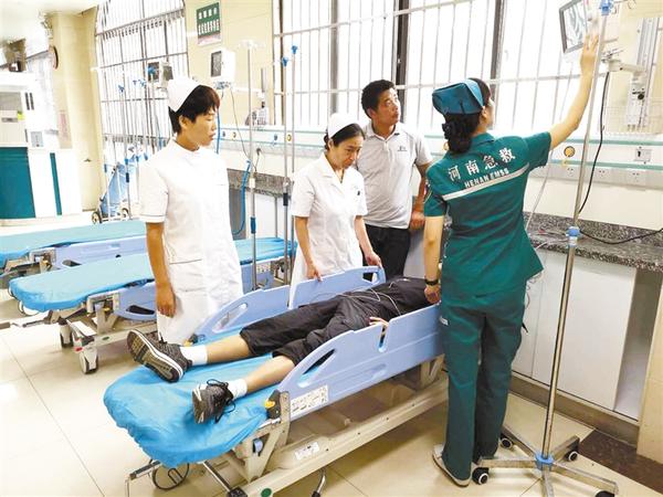 本报讯 (记者 窦赢 文/图) 8月17日,一位患者在市中心医院候诊时,突然晕倒,门诊医护人员齐心协力抢救患者。