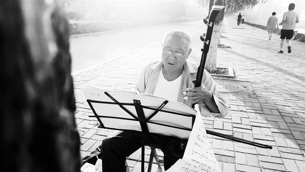 为庆祝省运盛会,商水县开展了形式多样的全民健身活动。图为一老人在阳城公园自娱自乐演奏乐器。 郭涵泽 摄