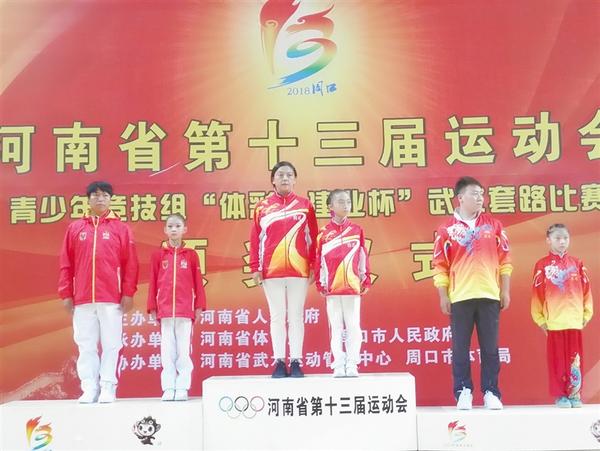 9月16日是省十三运会青少年竞技组武术套路比赛的第二个比赛日,周口队队员张博涵在女子丙组剑术比赛中获得银牌。图为张博涵(左二)与教练同登领奖台。记者 姬慧洋 摄