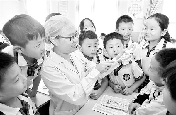 9月19日,在石家庄新乐市实验小学,口腔医生指导学生学习正确的刷牙方法。在第30个全国爱牙日即将到来之际,各地幼儿园、学校开展口腔健康教育活动,邀请牙科医生为小朋友讲解护牙知识,进行口腔检查,培养他们从小养成爱牙护牙的好习惯。 新华社发