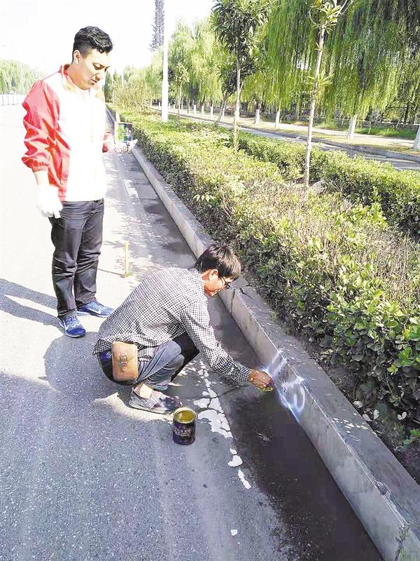 校准后,袁林教授骑着自行车,在“周马”组委会一名工作人员的骑行陪伴下,由交警驾驶警车引领,从“周马”起点出发,缓缓前行,开始对赛道距离进行具体测量。每到一公里处,袁林教授都要停下来,采集数据。“周马”组委会工作人员随即在测量确定的每一公里处喷漆,做好标记。
