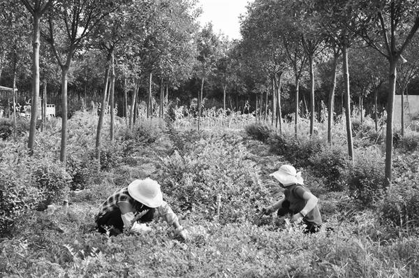 张明乡以农民种植合作社为依托,建成占地1000多亩的市政绿化树红叶石楠繁育基地,安排周边村民200多人在基地务工,带动100多户贫困户脱贫致富。图为村民在炎坤种植农民合作社为幼苗除草。