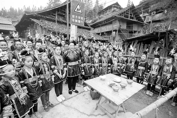 10月18日,在贵州省榕江县栽麻镇宰荡侗寨,村民们在村口演唱侗族大歌迎接游客。近年来,贵州省黔东南苗族侗族自治州榕江县在侗族大歌传承中,采取引导民间歌师社会传承、侗族大歌进校园等方式,让侗族大歌得以薪火相传。新华社发