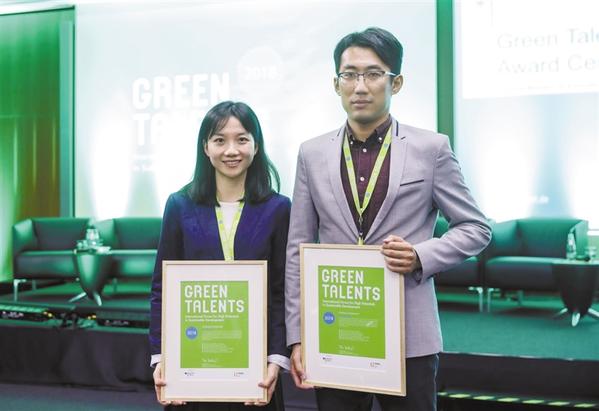 10月22日,在德国首都柏林的德国联邦教研部,来自中国的获奖者周迪(左)和单钰理在“绿色精英”奖颁奖仪式后合影。德国联邦教研部22日在柏林授予包括两名中国学者在内的全球25名青年科研人员“绿色精英”奖,以表彰他们在可持续发展领域的创新研究。新华社发