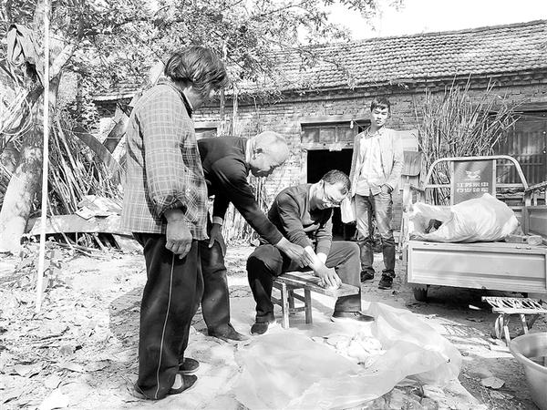 天气转冷,共青团郸城县委驻宁平镇张集行政村工作队加大走访力度,走村串户,了解贫困群众的生产生活需求,为他们解难题,办实事。图为近日团县委驻张集行政村第一书记王地伟在帮贫困户削红薯。记者 卢好亮 摄