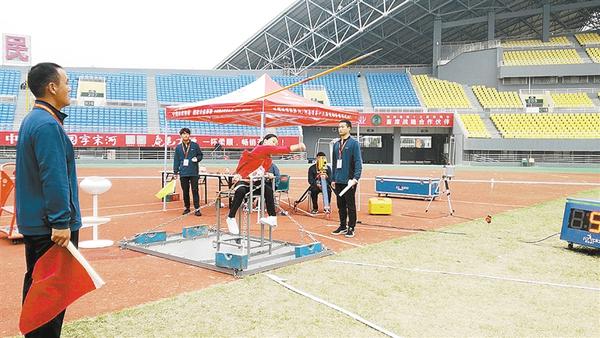 10月25日上午,省第七届残运会标枪比赛在市体育中心体育场进行。在标枪赛场,一些下肢残疾的女运动员,通过一些特殊器械辅助投掷标枪,勇于挑战自我,努力投掷出自己最好成绩。图为比赛现场。 记者 牛思光 摄