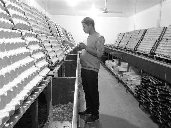 沈丘县裕顺生物科技有限公司注重科技创新,采用温室车间自动控温饲养蝎子新技术,取得了成功。据了解,自动化控温饲养蝎子具有生长快、循环饲养周期短、成活率高等优点,其经济效益是常规饲养的三倍以上。图为10月29日,该公司负责人正在自动化控温饲养车间检查雏蝎子的生长情况。谢辛凌 摄