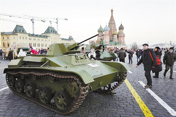这是11月7日在俄罗斯首都莫斯科红场展出的T-60坦克。当日,莫斯科民众在红场参加系列活动,纪念十月革命101周年。新华社发