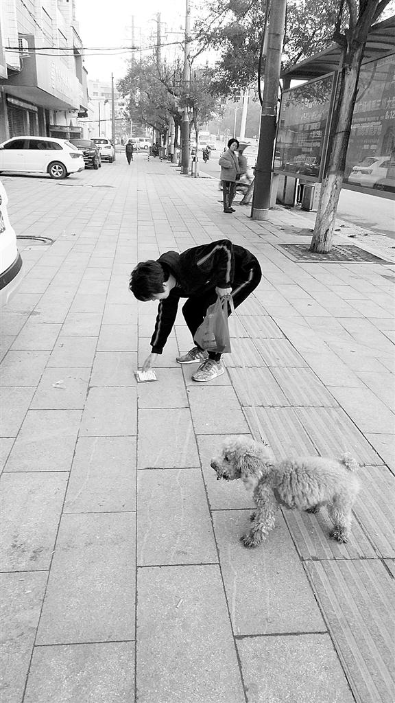 在此,笔者呼吁全社会每个人都要爱护我们的公共环境,爱护我们美丽的家园,也希望家有狗狗的市民提高个人素质,像这位可爱的大姐一样争做文明遛狗人。(啄木鸟志愿者 杨敏 文/图)