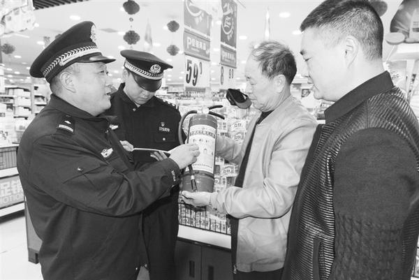 近日,扶沟县公安局包屯派出所组织民警对辖区宾馆、学校、沿街商铺的消防设施、器材配置等进行全面检查。图为11月6日,民警对一超市内的消防设施进行检查。②7记者 谢永静 通讯员 李龙喜 摄