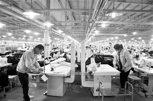 河南阿尔本制衣有限公司位于商水县纬四路,一期占地面积200亩,拥有员工3000余人,主要生产棱织类中高档时装,年产量1200万件,是豫东南较大的服装生产出口企业。图为千人车间一角。 记者 付永奇 摄