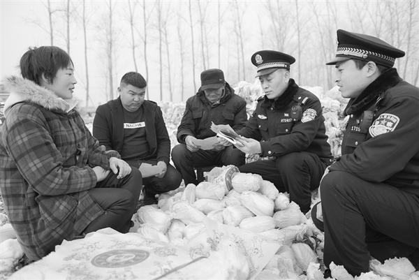 为增强群众岁末年初的安全防范意识,连日来,扶沟县公安局吕潭派出所民警走到田间地头,为辖区群众讲解治安防范知识,帮助提高识别电信诈骗技能。图为12月25日,民警正在为菜农解答电信诈骗防范疑难问题。