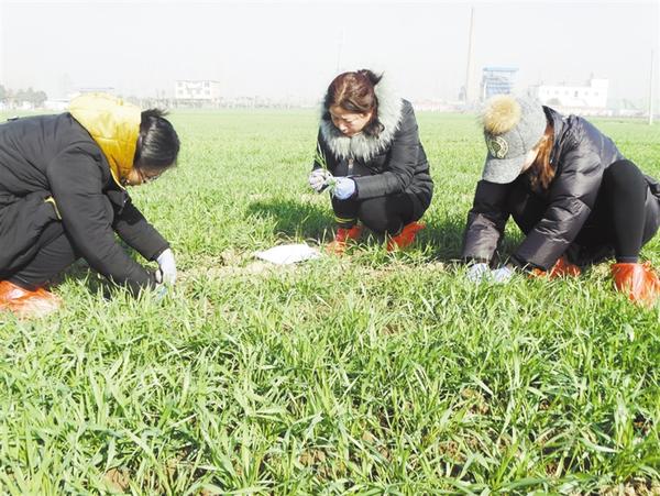 12月21日,沈丘县农技推广服务中心的农技人员在周营镇一个万亩小麦高产示范方内查看小麦墒情、虫情、分蘖数等。近日,该县组织农技人员,深入田间地头,实地查看小麦长势,以便更好地引导群众做好冬季小麦科学管理工作。