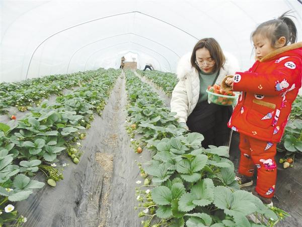 12月24日,在沈丘县付井镇王营村大棚蔬果产业扶贫基地,游客正在采摘草莓。去年以来,该镇积极发展草莓产业,推进休闲观光农业和乡村旅游融合发展,建起了集观赏、采摘、休闲为一体的草莓田园综合体,使乡村“采摘游”成为助民增收的重要方式。