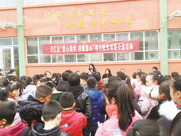 图一:12月21日下午,川汇区“爱心助学 衣暖童心”助力脱贫攻坚公益活动暨党庄小学校服捐赠仪式举行。区委常委刘娟出席捐赠仪式。本次活动由共青团川汇区委、区妇联合举办,共为党庄小学学生捐赠校服350套,价值4万元。