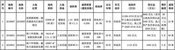 备注:(1)具体建设方案须报规划部门批准后实施,土地出让合同签订后,12个月内必须开工建设,工期30个月,土地成交价款需在土地出让合同签订后60日内缴清,交地时间6个月内。(2)2018007号宗地拍卖出让起始价、竞买保证金依据具有资质的地价评估机构评估价格,经政府办、发改委、财政局、监察委、法制办、住建局、审计局、房产办、城市综合执法局集体研究:出让起始价为11109.0710万元(其中土地出让起始价为6050万元,地上资产5059.0710万元),竞买保证金9900万元(其中土地竞买保证金5400万元,地上资产竞买保证金4500万元),增价幅度50万元。(3)2018007号宗地上有部分建筑物,地上资产价格为5059.0710万元,与土地捆绑出让。在土地成交后,将地上资产价格5059.0710万元转入淮阳县财政局非税收入专户,开户行:中国建设银行淮阳支行,账号:41001557910050001478。(4)2018021、2018041号宗地属两层以上标准化厂房,具体产业类型为木材加工和木、竹、藤、棕等制品业,投资强度≥3750万元/公顷。(5)具体以规划部门出具的规划指标为准,详见《规划条件通知书》。