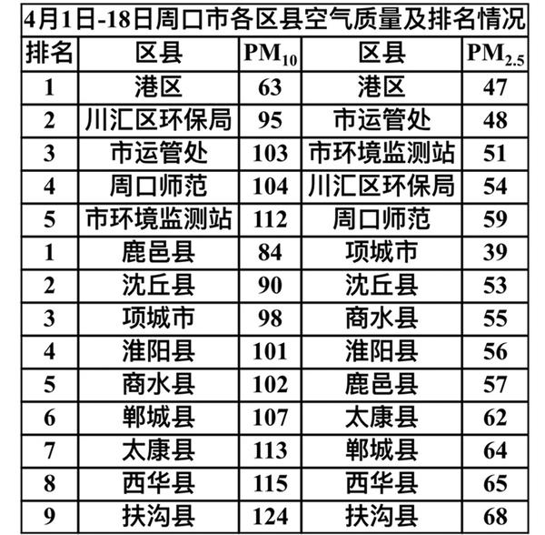 4月1日-18日,周口市PM10排前三名的县市为:鹿邑县、沈丘县、项城市;PM2.5排前三名的县市为:项城市、沈丘县、商水县。