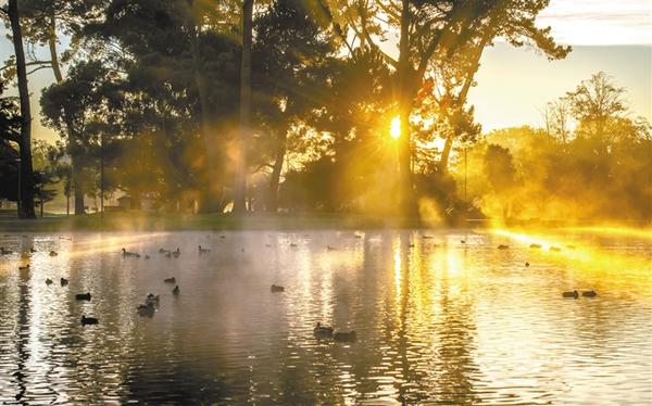 静谧清晨 这是4月20日清晨拍摄的新西兰克赖斯特彻奇哈格利公园的维多利亚湖。