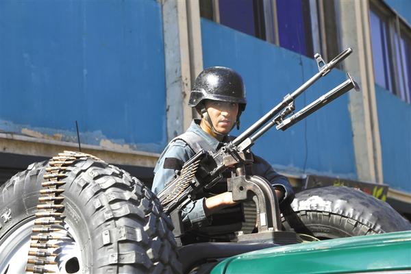 4月20日,在阿富汗首都喀布尔市中心,袭击发生后安全部队成员在街头警戒。阿富汗政府官员20日说,阿首都喀布尔市中心的通信部办公大楼外当天中午发生爆炸和交火,目前已造成至少3名袭击者死亡。新华社发