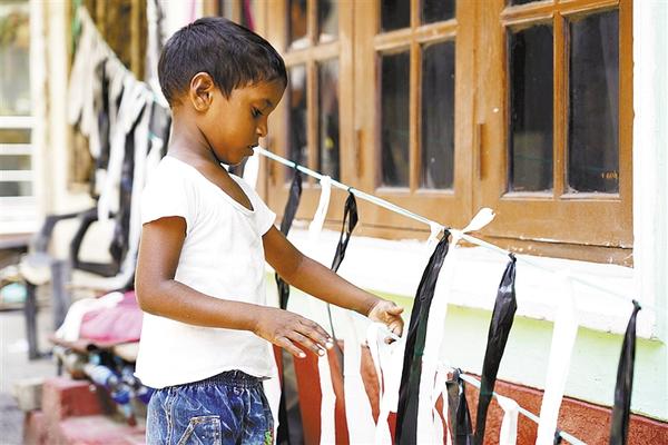 图为:4月23日,在斯里兰卡科伦坡,一名男孩抚摸为悼念爆炸案遇难者而挂起的丝带。
