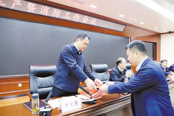 会上,各乡镇和县安委会成员单位负责人向李全林递交了《2019年安全生产工作目标责任书》和《2019年消防工作目标责任书》(如图)。王智华就做好2019年安全生产和消防工作进行了安排部署。周俊领宣读了《郸城县人民政府关于表彰2018年度安全生产工作先进单位和先进个人的通报》。崔家龙宣读了《郸城县人民政府关于表彰2018年度消防工作先进单位的通报》。县应急管理局、县消防救援大队负责人就2018年全县安全生产工作和消防工作分别进行了汇报。