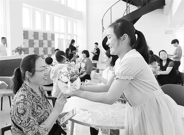 为传承中华民族传统美德,广泛推动全民阅读活动深入开展,大力弘扬社会主义核心价值观,近日,项城市图书馆举办了“‘唱起来、跳起来、读起来’欢乐进万家——朵朵鲜花送妈妈”活动。图为一名孩子把自己动手制作的花艺作品送给妈妈。 记者 卢好亮 摄
